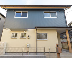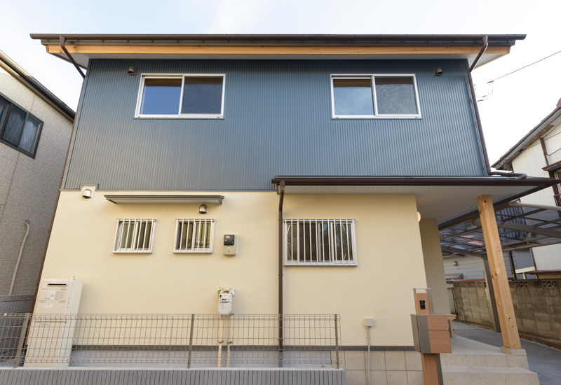 外観もシンプルにまとめます。弾性リシン吹きつけとガルバリウム鋼板で仕上げるのがベースです。
